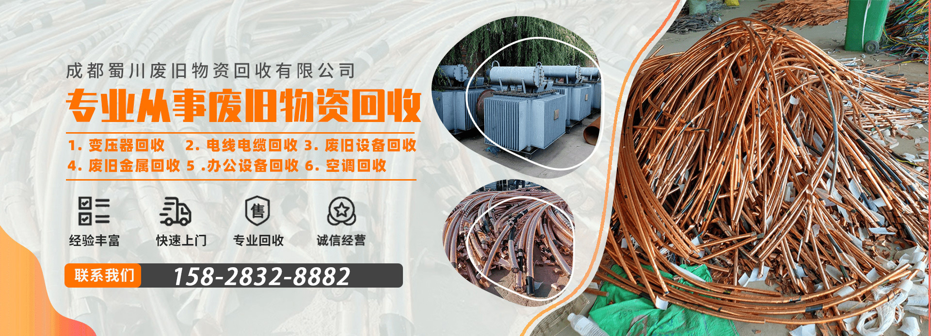 成都蜀川废旧物资回收有限公司,是一家专业的废旧物资回收公司,有着丰富的回收经验。长期以来,公司以“专业回收,诚信为本”为原则,凭借热情周到的服务,良好的商业信誉与各大型工厂、商业场、酒店建立了良好的合作关系。        公司主营: 1. 变压器回收;2. 电线电缆回收;3. 废旧设备回收; 4. 废旧金属回收;5 .办公设备回收;6. 空调回收等。公司本着“回收再利用”的想法,帮助广大客户处理二手闲置变现,为环境保护事业做出自己的贡献。是您值得信赖的合作伙伴,我们将为您提供专业的服务,诚挚欢迎各界人士前往洽谈合作。